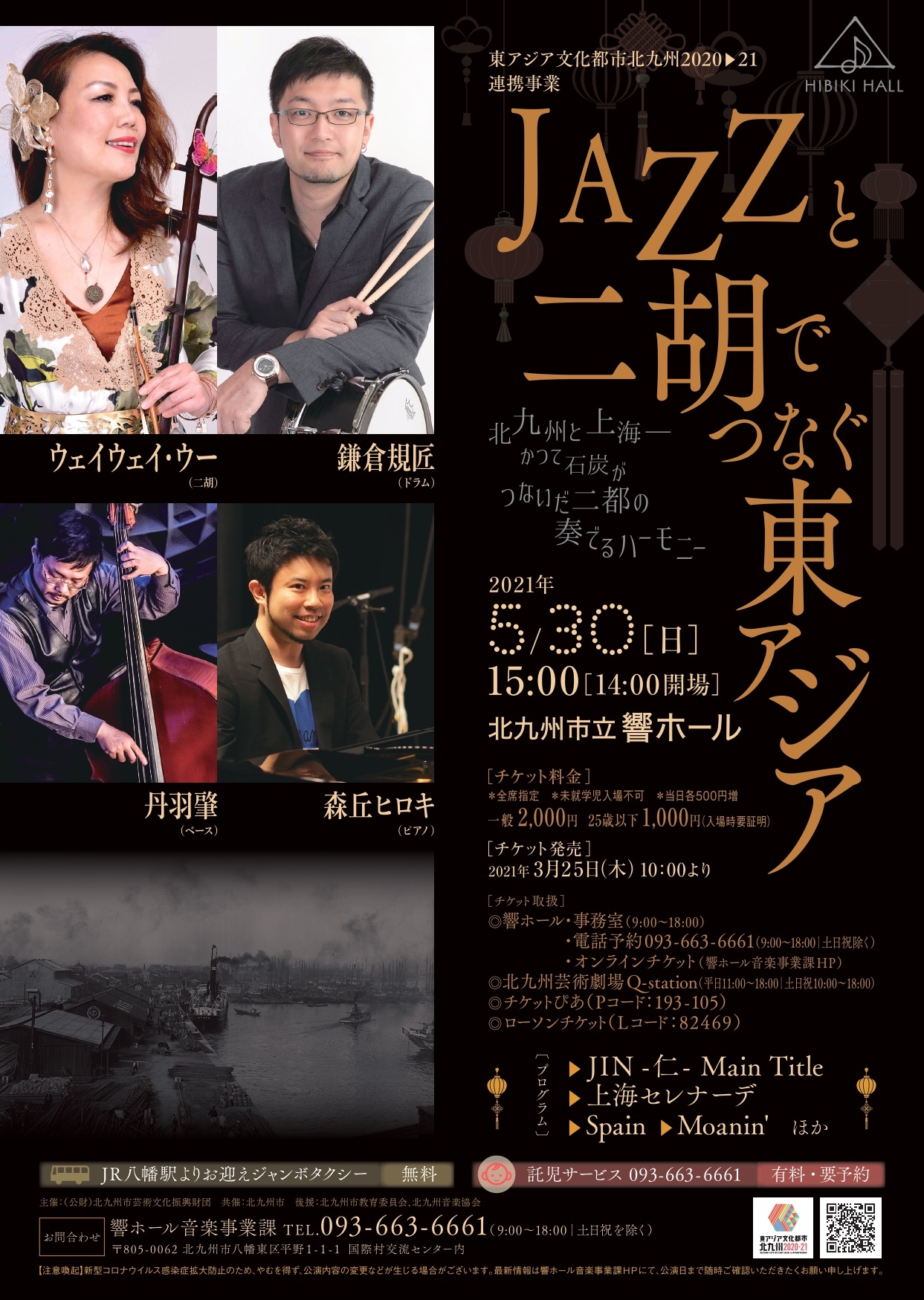 戦前、欧米文化が盛んだった上海から、石炭航路を通じて北九州に伝わったジャズ。当時の人気曲から現代も奏で継がれるスタンダードナンバーまで、東アジアのジャズ史に輝く名曲を、ジャンルを超えて国際的に活躍する上海出身の二胡奏者ウェイウェイ・ウーを迎え、北九州市出身のジャズドラマー鎌倉規匠らジャズメンとの異色のコラボレーションでお届けします。