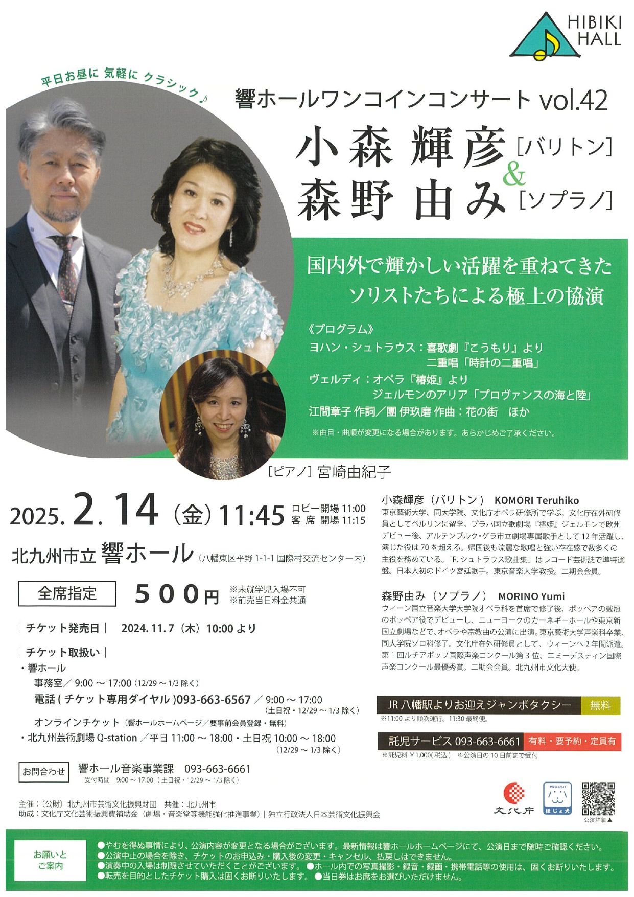 2024年度第4弾は、日本人初のドイツ宮廷歌手として活躍してきた小森輝彦(バリトン)と、北九州市文化大使でオーストリア在住の森野由み(ソプラノ)が登場。