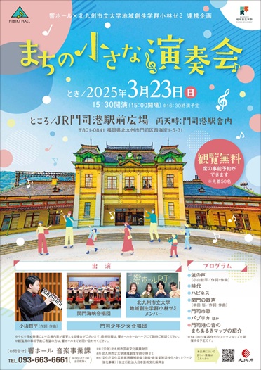 まちづくりをテーマに活動する北九州市立大学・小林敏樹ゼミと連携し、アーティスト、大学生、ホールが一丸となって取り組む「まちづくり+音楽」の地域連携プロジェクトです。ワークショップやコンサートを通じて音楽が市民の方々により身近に感じてもらえるように取り組んでいます。