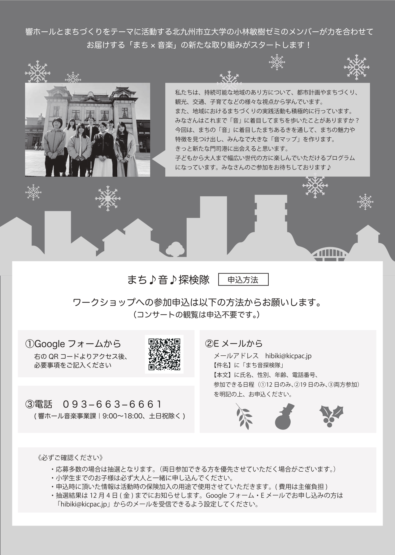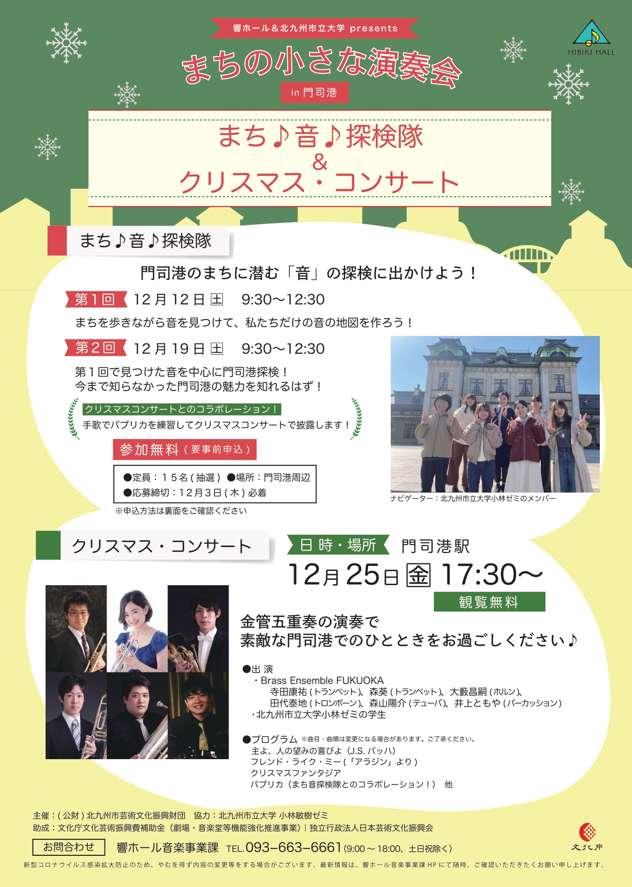 【中止】まちの小さな演奏会in門司港 まち♪音♪探検隊 日程・チケット料金情報はこちら 北九州市立大学・小林敏樹ゼミ 響ホールとまちづくりをテーマに活動する北九州市立大学の小林敏樹ゼミのメンバーが力を合わせてお届けする「まち×音楽」の新たな取り組みがスタートします! まずは、2回に分けて、学生自身が企画・進行する「まち歩きワークショップ」を行います。 そして12月25日には、まち歩きの舞台の中心地である、門司港駅でクリスマス・コンサートを行います。クリスマスを彩るコンサートにぜひお立ち寄りください。チラシ オモテ面 ウラ面 ナビゲーター 北九州市立大学・小林敏樹ゼミのメンバー お問い合わせ 響ホール音楽事業課 TEL 093-663-6661(9:00~17:00|土日祝除く) 日程・会場 会場:門司港周辺 2020年12月12日(土) 【第1回】まちを歩きながら音を見つけて、私たちだけの音の地図を作ろう! 2020年12月19日(土) 【第2回】第1回で見つけた音を中心に門司港探検! 料金 参加費 : 無料(要事前申込) 定員 15名*応募多数の場合は抽選となります。*両日参加できる方を優先させていただく場合がございます。 申込方法 申込終了しました。 申込締切 2020年12月3日(木) 必着