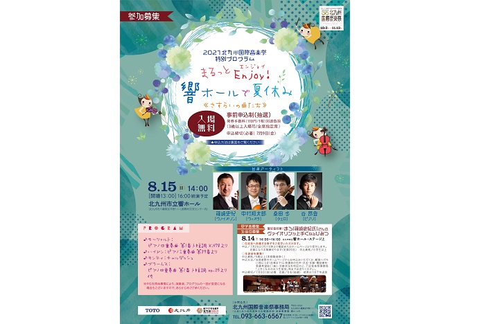 2021北九州国際音楽祭 特別プログラム まるっとEnjoy!響ホールで夏休み <さすらいの曲たち> 日程・チケット料金情報はこちら 詳しくはこちらをご確認ください。 お問い合わせ 北九州国際音楽祭事務局 TEL 093-663-6661(9:00~17:00|土日祝除く) オフィシャルサイト 日程・会場 会場:北九州市立響ホール 2021年8月15日(日)14:00~16:00 *受付は終了いたしました。