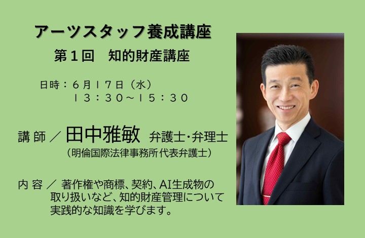 文化芸術分野に携わるスタッフの専門性向上と現場対応力の強化を目的として、著作権や商標、契約、AI生成物の取り扱いなど、知的財産管理について実践的な知識を学びます。